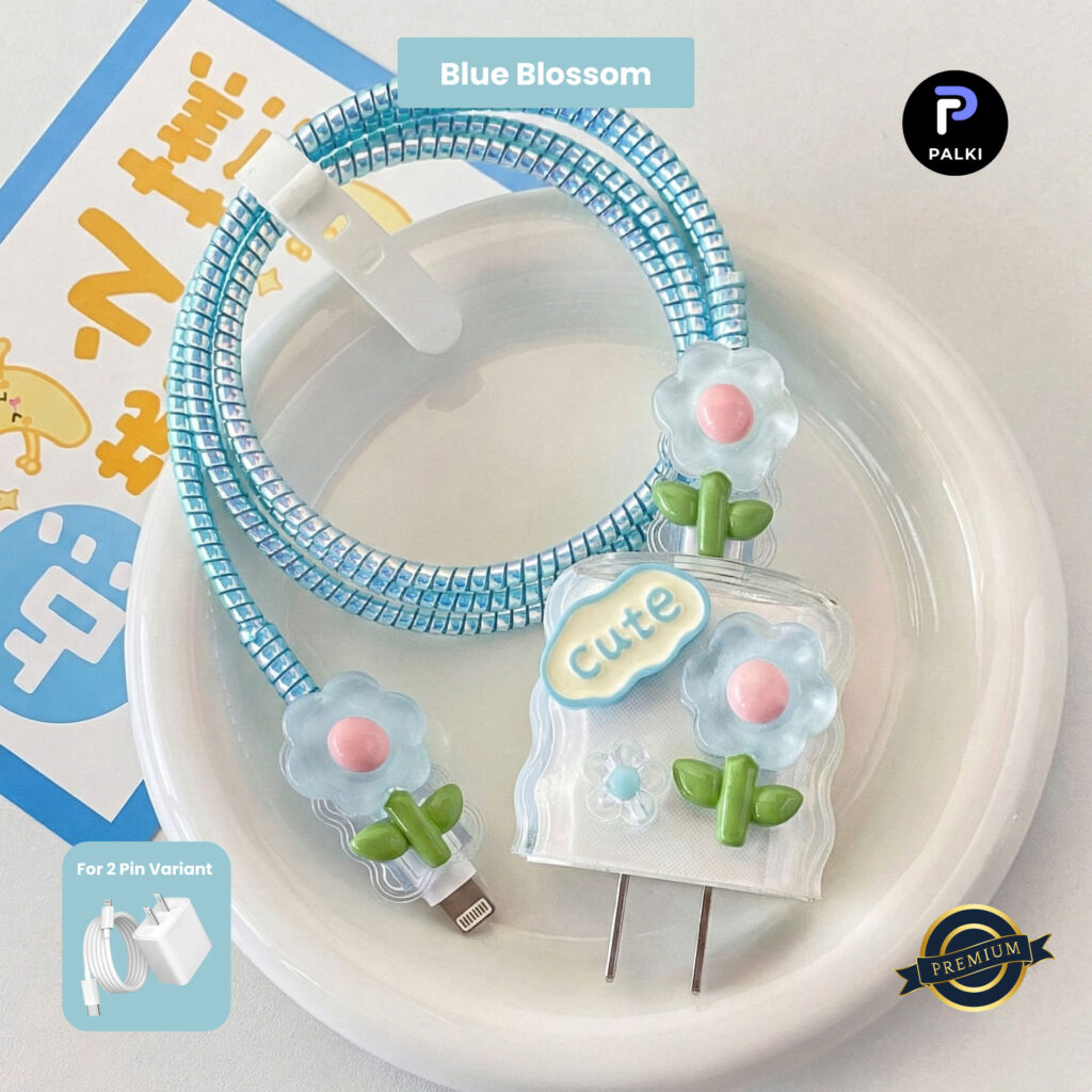 2 Pin Premium – iPhone Charger Cover 5 Piece Set – Blue Blossom