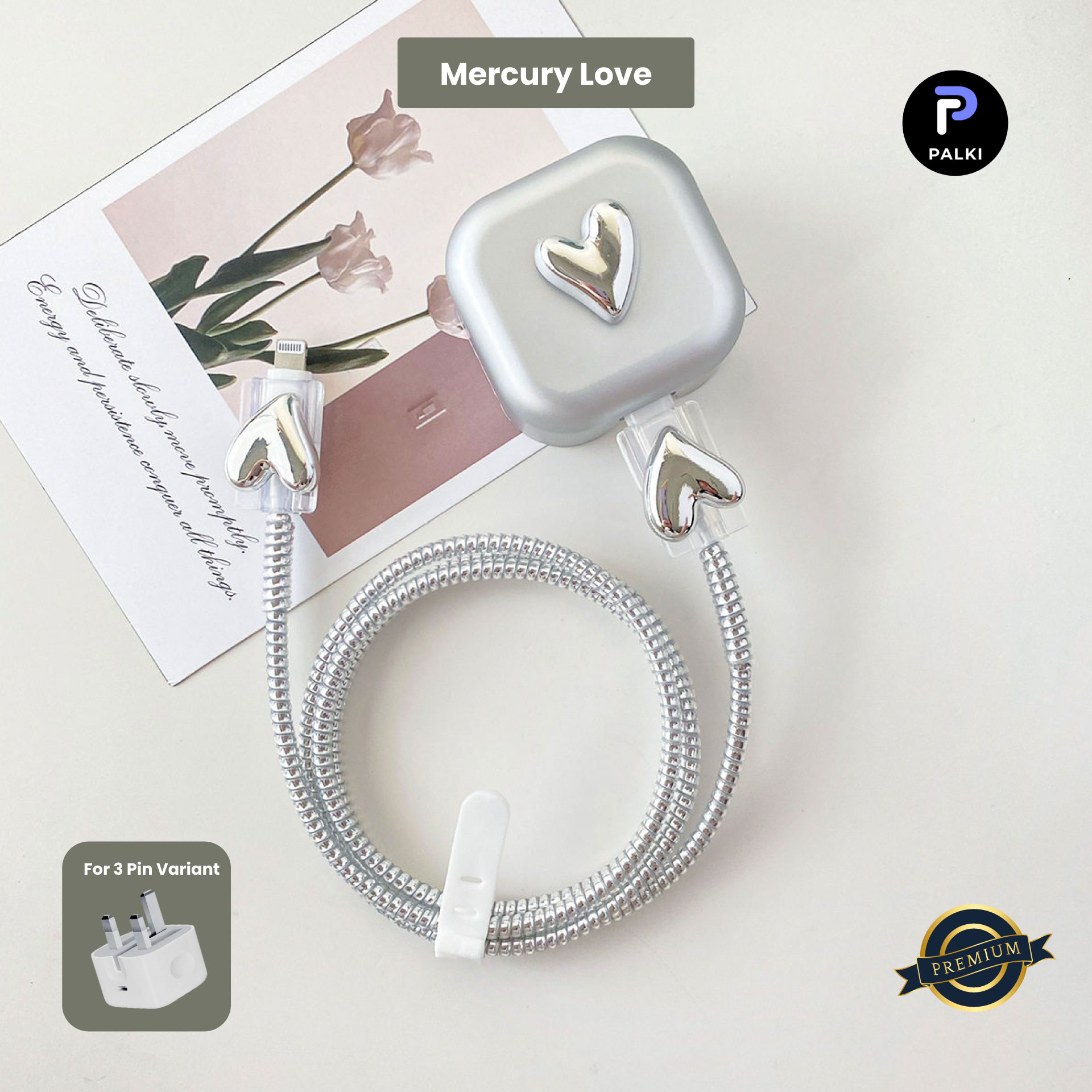 3 Pin Premium - iPhone Charger Cover 5 Piece Set - Silver Heart